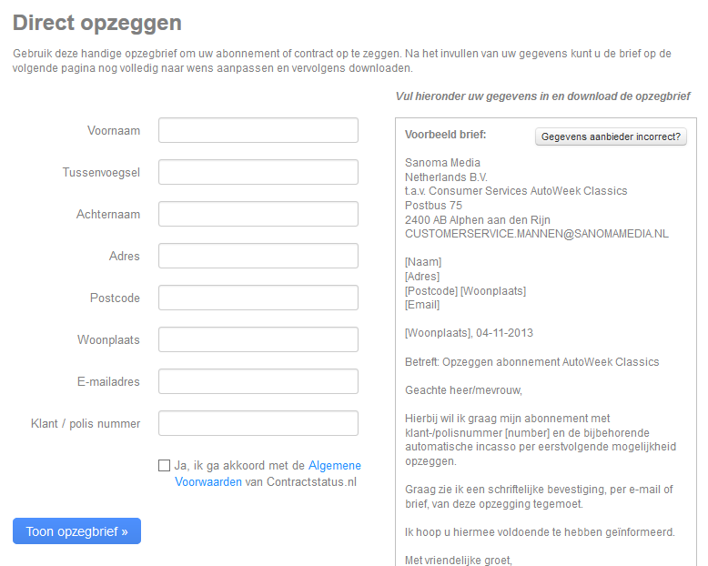 Wij hebben een grote database opgebouwd met adressen van vele aanbieders van abonnementen en/of contracten. Zo kan jij gemakkelijk opzeggen, denk hierbij bijvoorbeeld aan: Mobiele telefonie, Telecom, Energie, Verzekeringen, Goede doelen, Sportscholen, Tijdschriften, Dagbladen, etcetera.